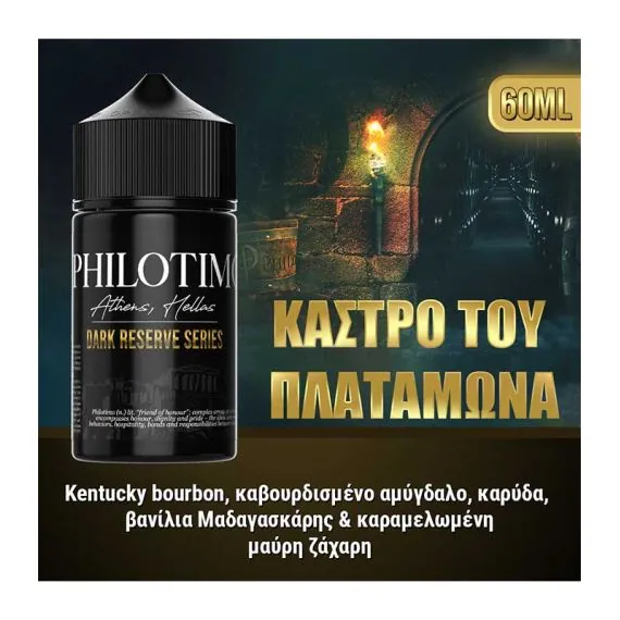 PHILOTIMO - DARK RESERVE ΚΑΣΤΡΟ ΠΛΑΤΑΜΩΝΑ (KENTUCKY BOURBON, ΚΑΒΟΥΡΔΙΣΜΕΝΟ ΑΜΥΓΔΑΛΟ, ΚΑΡΥΔΑ, ΒΑΝΙΛΙΑ, ΜΑΥΡΗ ΖΑΧΑΡΗ) - 6ML/ 60ML